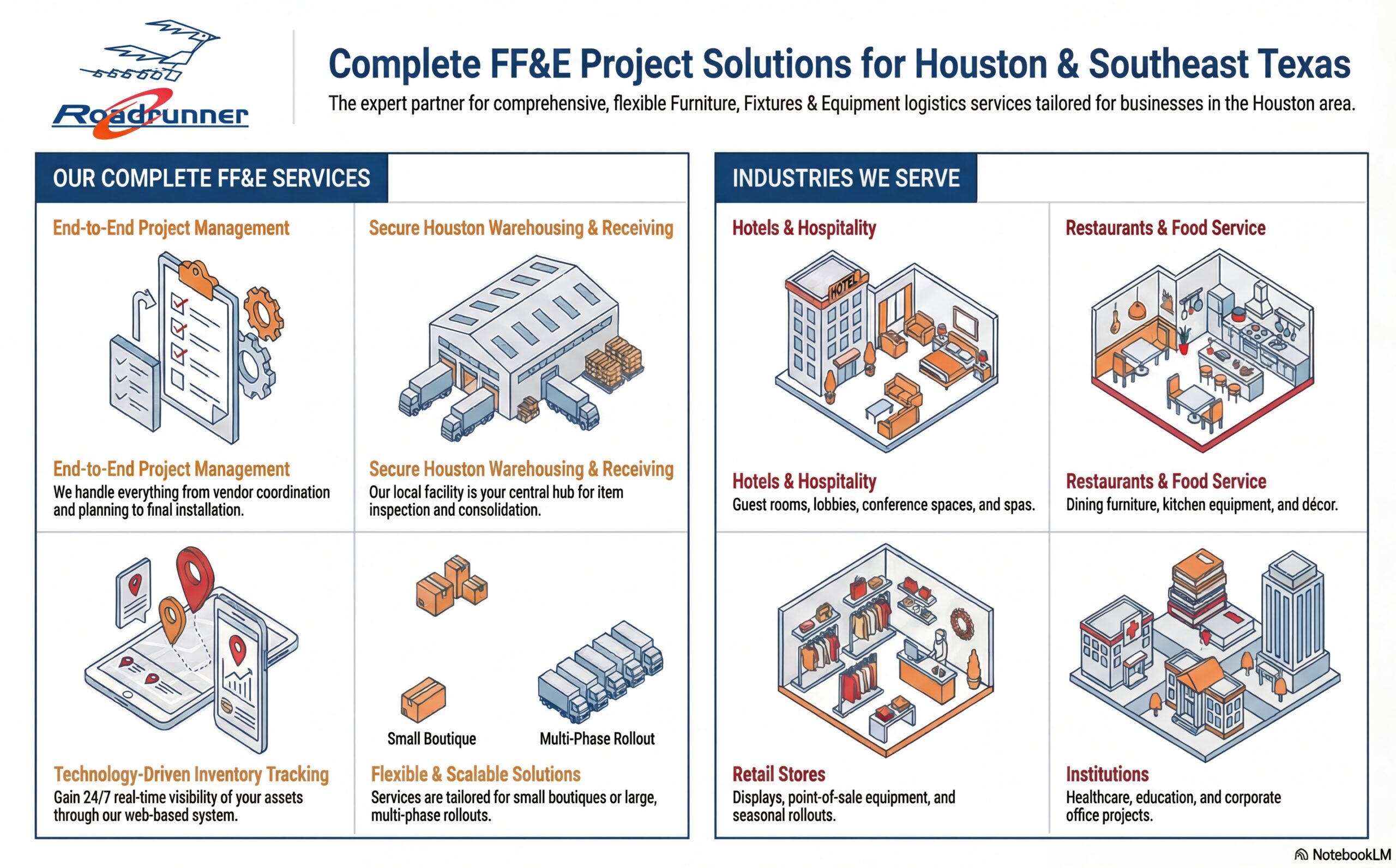 Roadrunner Moving & Storage manages the complete lifecycle of Furniture, Fixtures & Equipment (FF&E) — from procurement and warehouse receiving to delivery, installation, and final placement.