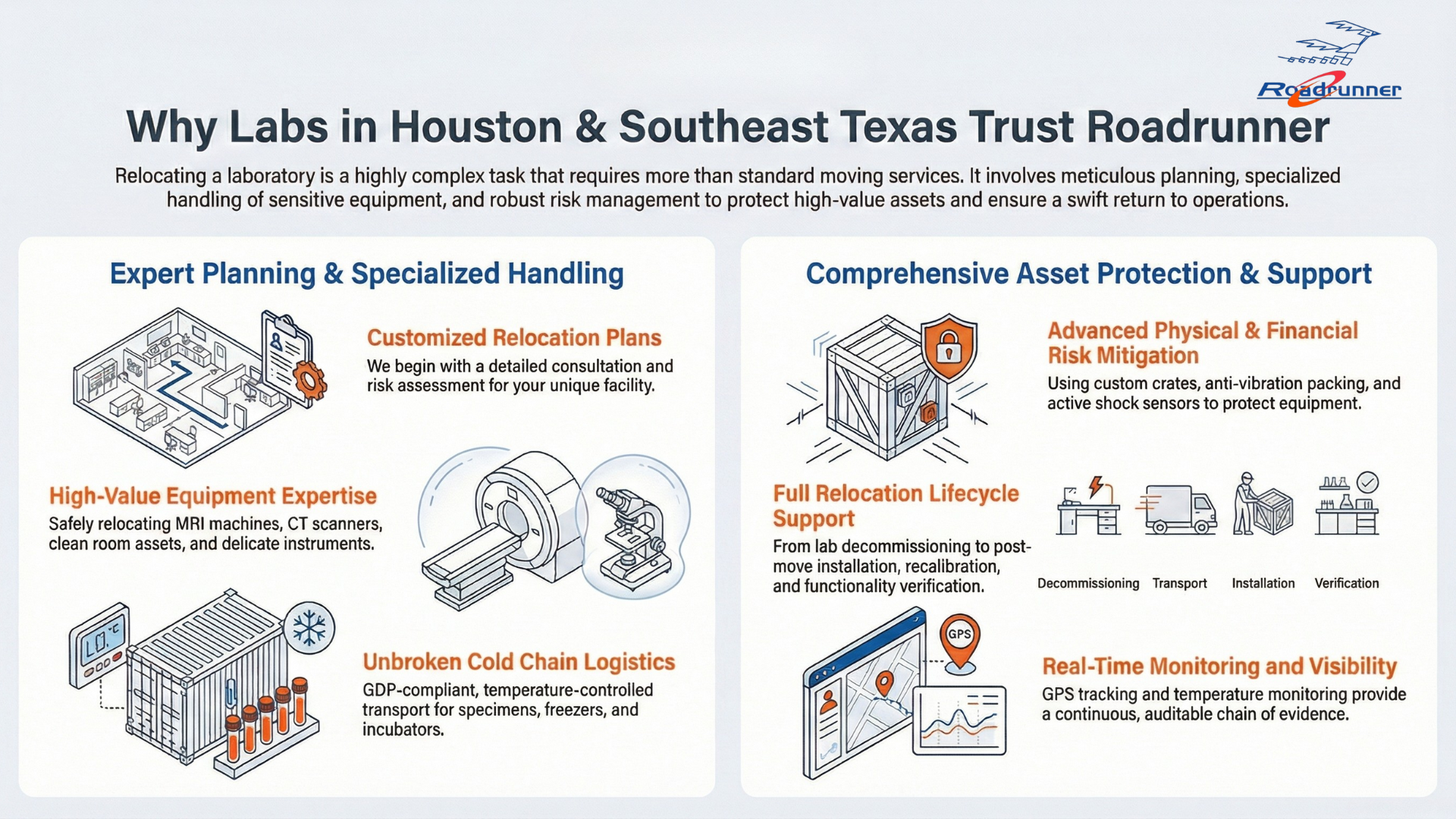 From the Texas Medical Center to biotech startups, Houston's scientific community trusts Roadrunner Moving & Storage to handle their most critical assets with precision and care.